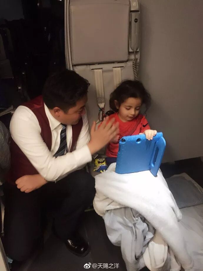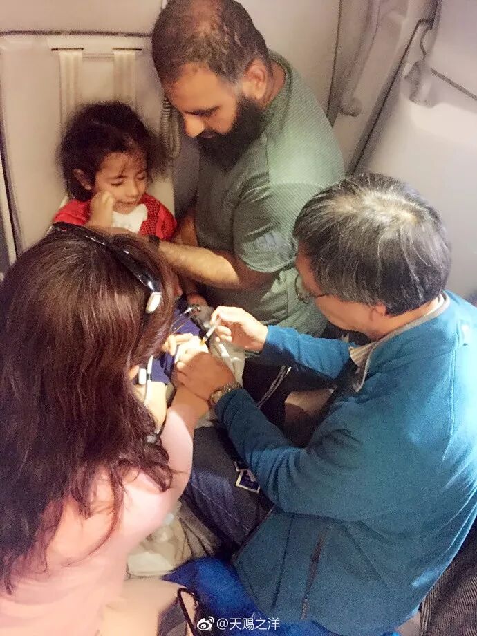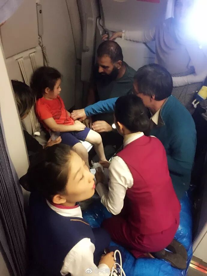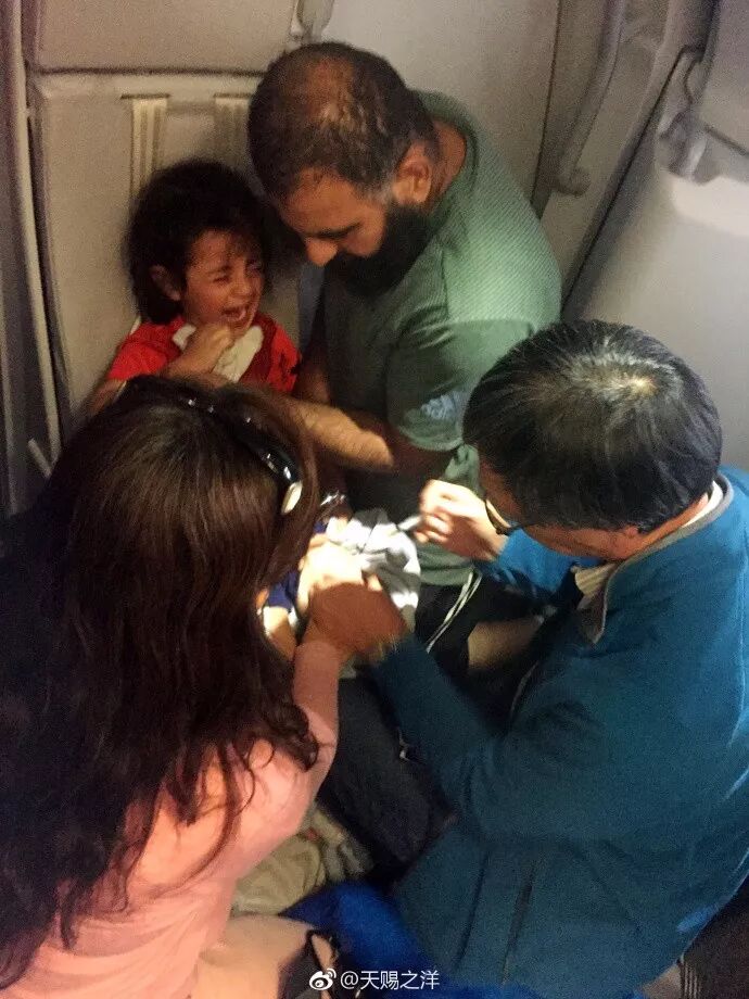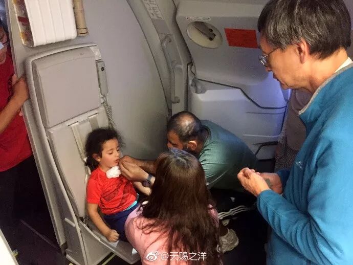 幸运的是,一位中国籍乘客医生和一位美籍亚裔乘客医生马上联系了乘务人员,第一时间赶到孩子身边!