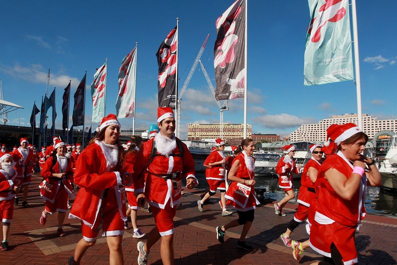 不仅没有雪景,还异常炎热的圣诞节也是很有仪式感的,圣诞老人跑,无数人身穿套装,顶着酷暑,只为了增添一丝节日的气氛。