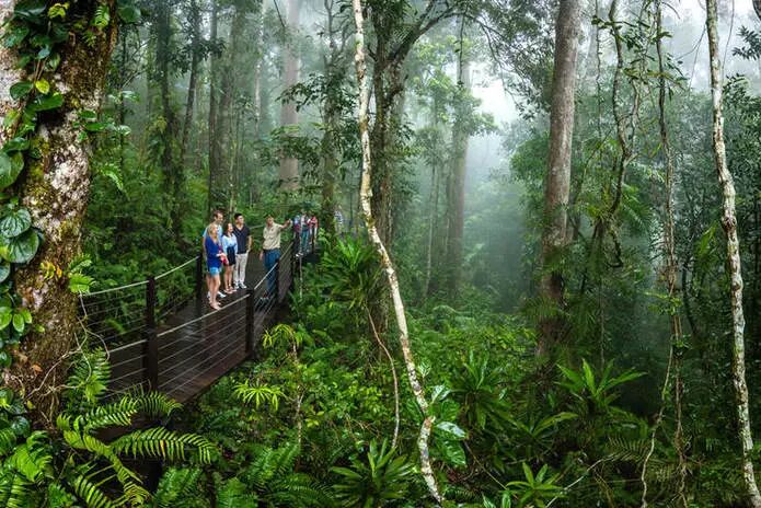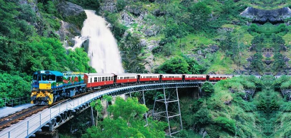 乘坐库兰达观光火车至库兰达。火车将穿越巴伦峡谷 (Barron Gorge),蜿蜒34公里,整个旅途需要1小时45分钟。最后乘坐Skyrail雨林缆车返回。缆车行程7.5公里,需时90分钟。