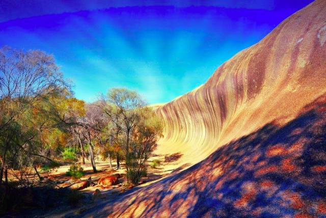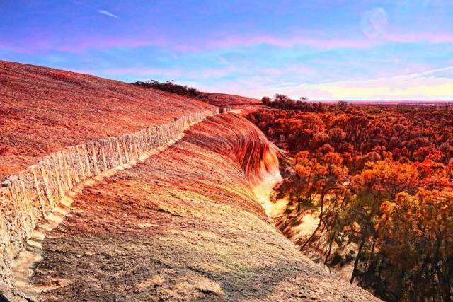 在西澳的Perth,有一个名叫海登岩的巨大岩层,每年四月,波浪岩的色彩与满山秋色相映成趣,尤是不容错过。