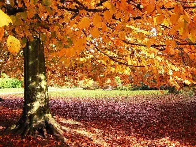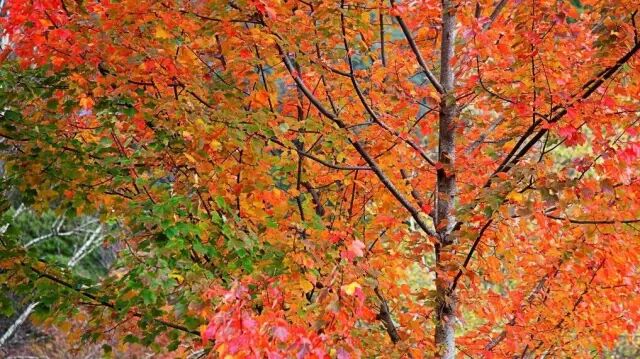鲜红艳丽的枫叶,加上榆树、橡树的黄叶,像雪花一般飘落纷飞,在秋日里放肆地舞蹈、盘旋。